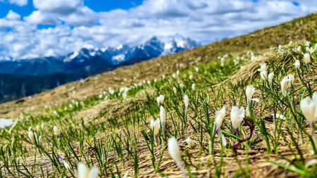 Group of blooming flowers (Crocus scepusiensis) with the peaks in the background, which heralds the arrival of spring in the mountains