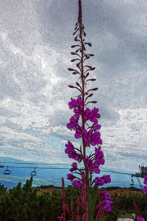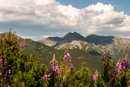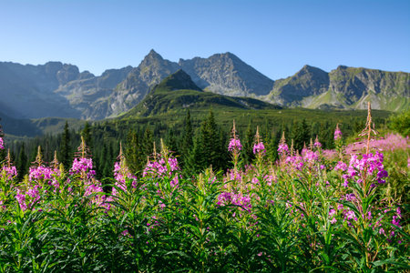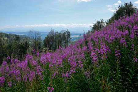 blooming fireweed, willow herb flower on the mountain meadow with Tatra Mountains in the background