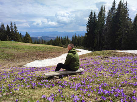 Wonderful spring view of Alpine crocuses blossom in the mountains of the Carpathians on top of the mountain. Fresh beautiful purple crocuses. Flowering blue crocus in spring. amazing nature scene.Bukovel.