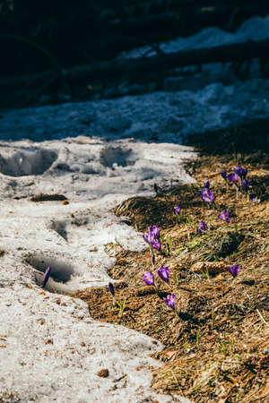 Flowers under the snow in spring in Alps, Flora of Europe. spring going after winter.