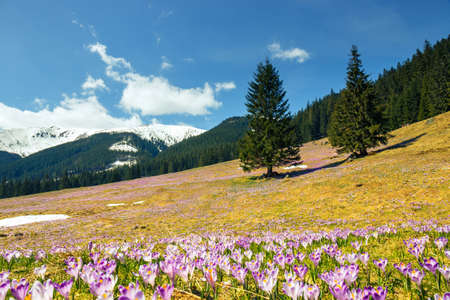 Beautiful blooming crocuses in chocholowska valley in tatra mountain