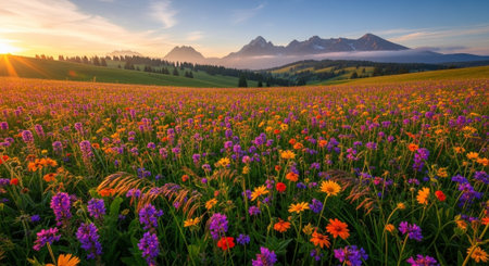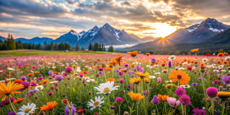 A close-up of vibrant wildflowers in a grassy field with majestic mountain ranges in the background. The setting sun casts a warm golden glow over the landscape, creating a serene and peaceful atmosphere.