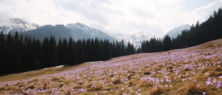 Dolina Chocholowska with blossoming purple crocuses or saffron flowers,Tatra mountains, Poland.