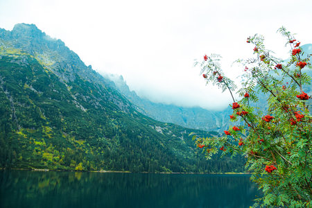 Beautiful mountain landscape with rowanberry on the shore of lake. Sea Eye lake in Poland. landscape of nature.