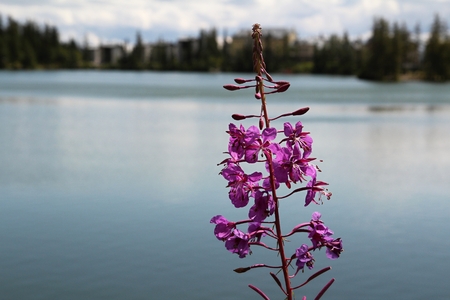 Ivan-tea flowers on the background of a high-mountainous lake in Pirin National Park, Bulgaria