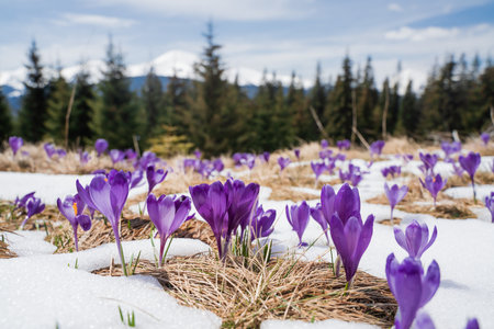 carpet of blooming crocuses in chocholowska valley in tatra mountains