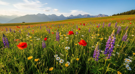 A vibrant field of wildflowers blooms in the foreground, showcasing a diverse range of colors and textures.