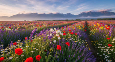 Panoramic view of blooming field of poppies, daisies and alpine mountains in the background at sunset