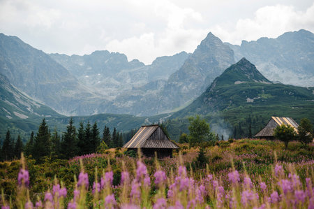 Scenic mountain landscape with wooden huts and purple wildflowers in the foreground, surrounded by lush greenery and towering peaks under a cloudy sky.
