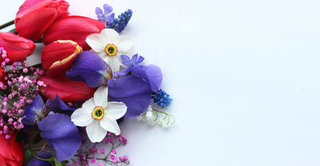 Bouquet of spring flowers on a white background with copy space