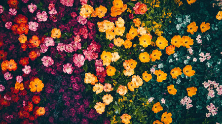Vibrant flowerbed with colorful flowers and green background