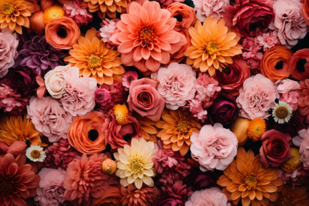 A vibrant texture of various blooming flowers presenting a beautiful and colorful floral assortment