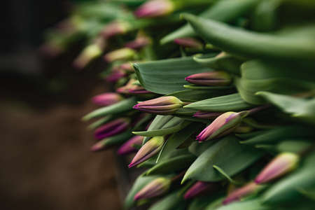 This image showcases a collection of blooming purple tulips, their petals displaying intricate textures. The composition employs a shallow depth of field, highlighting the flowers against a softer, blurred backdrop. The lighting appears natural, enhancing the rich color palette. Suitable for various editorial and commercial applications.