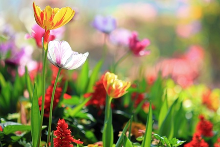 Beautiful colorful flowers in the garden with sunlight and bokeh