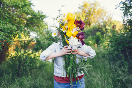 A young woman covered her face with a large bouquet of flowers. A girl in casual clothes is holding in her hands irises, peonies and chamomile against the backdrop of a green garden. summertime.