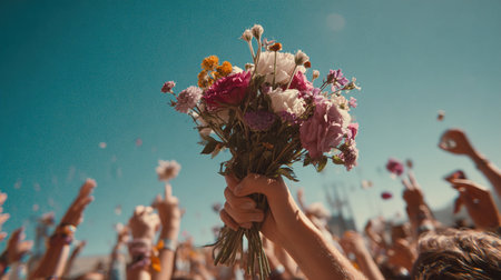 Hands holding a bouquet of flowers on the background of the crowd