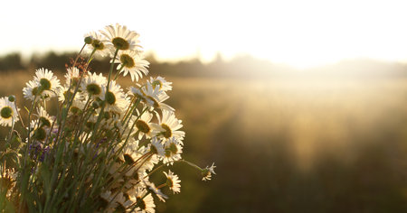 large bouquet of field daisies on a sunset background. summer landscape with flowers