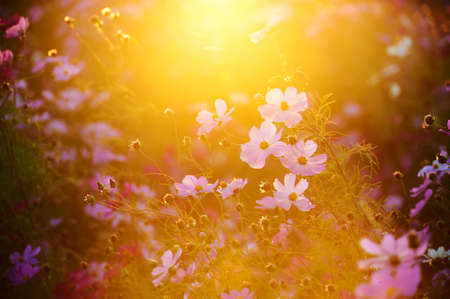 Colorful Cosmos flower field blooming on sunset.