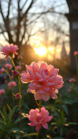 Soft pink flowers in rays of sunlight