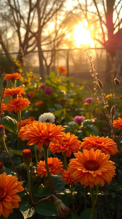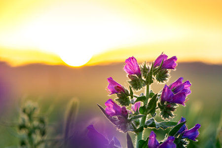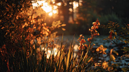 Wildflowers bathed in the warm glow of sunset. A tranquil scene of nature's beauty.