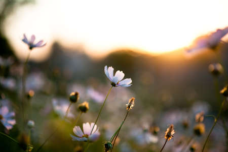Cosmos flowers in blooming with sunset