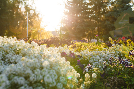 Beautiful flower bed with tender white blooming flowers in sunset back light. Blurry firs on background. Early autumn or late summer