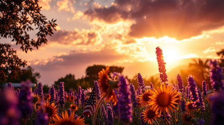 Sunset over a field of lavender and sunflowers in summer