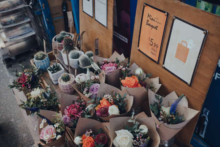 London, UK - March 06, 2020: Small bouquets and potted plants on sale outside a store in Soho, atrendy area of London famous for LGBTQ+ bars, restaurants and clubs.