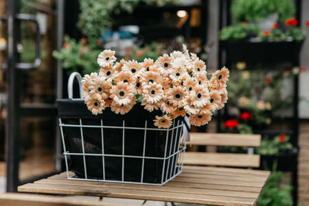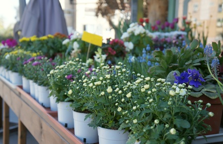 Flowers in the pots at the street near flower shop in defocused background