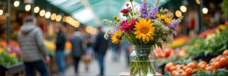 Crisp morning at a farmers market showcasing stands with organic produce and handmade floral arrangements. AI generated.