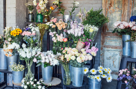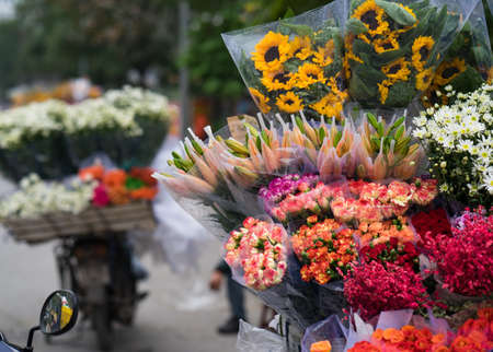 People buying flower bouquets, selecting vibrant arrangements for gifts and special occasions. High quality photo