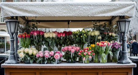 Frozen flower stall with roses and tulips covered in ice. Winter market scenery with vibrant bloom in cold weather for seasonal concept.
