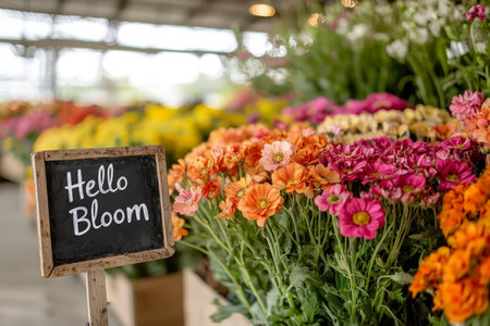 Colorful flower market with blooming spring flowers with sign Hello Bloom. Generative AI