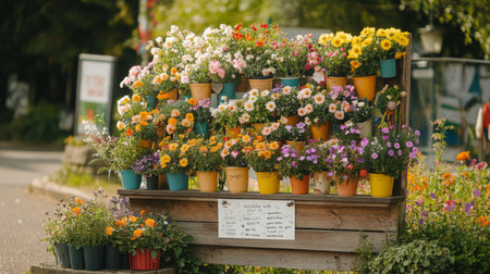 A picturesque street flower shop under a striped awning, with colorful vases of flowers and handwritten price tags on display.