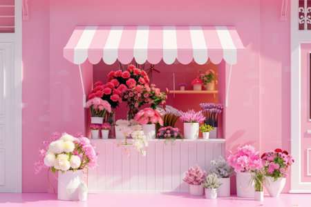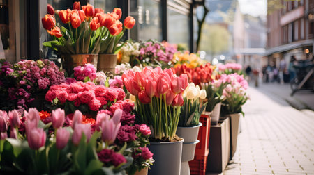 Flower shop front beautifully decorated with vibrant blooms and greenery, perfect for urban gardening and retail design concepts. With Generative AI technology.