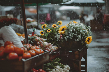 Sunflowers and other flowers at a market on a rainy day, with fresh produce in wooden crates.