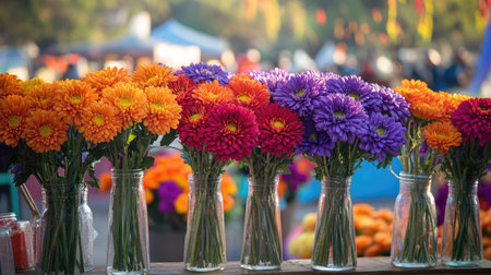 A rustic table filled with vases of vibrant chrysanthemums in orange, purple, and red tones, ready for sale at a local market.