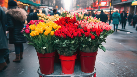 At a lively flower market, vendors arrange colorful bouquets of roses, tulips, and lilies. Heart-shaped signs promote Valentine's specials as sunlight fills the open space.