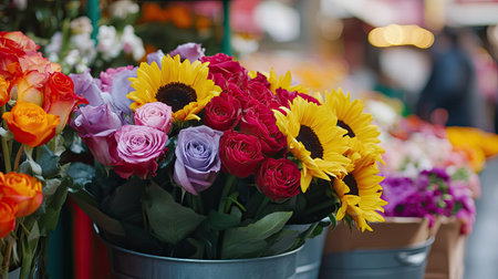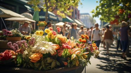 Vibrant flower bouquet in a bustling market setting with shoppers. That the image is generated using AI.