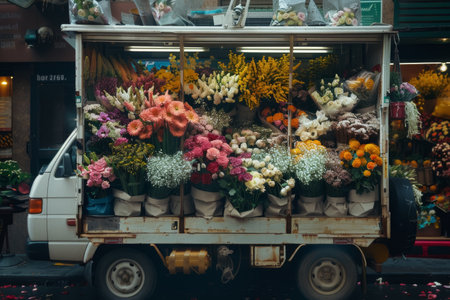 An open delivery van is filled to the brim with a stunning variety of colorful fresh flowers, ready for distribution in the city.