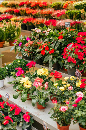 Beautiful display of various flowers in pots, showing vibrant colors and arrangements in a flower shop.