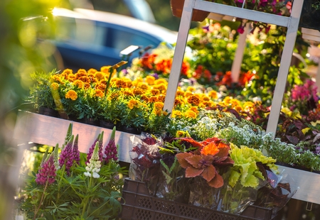 Garden Flowers Business. Flowers For Sale in the Garden Store Greenhouse.