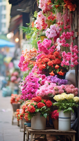 Modern street floral bazaar on asian style. Variety of fresh, vibrant flowers displayed for sale at outdoor market. Ideal for floral business promotions or advertisements. Vertical format