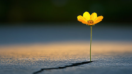 A vibrant yellow flower emerges through cracks in asphalt, showcasing resilience and beauty in an urban landscape. The sunlight highlights its delicate petals, symbolizing hope and determination.
