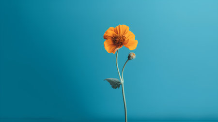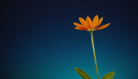showcases a single orange flower with five distinct petals, viewed from a low angle against a dark blue gradient background. The flower is positioned at the of a slender stem, which curves slightly. Two green leaves are visible below the bloom, adding a natural The studio lighting is soft, highlighting the smooth texture and bright color of the orange petals. The dark, gradient background provides a dramatic contrast, emphasizing the flower's form and upward orientation. The composition is...