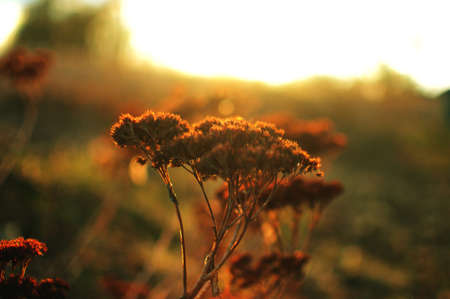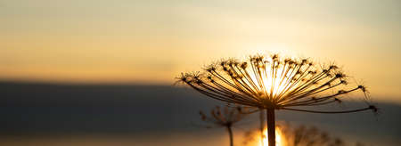 Natural landscape with dry grass on sunrise background. Concept. Close up of plants and flowers silhouettes against the bright orange sun during dawn.