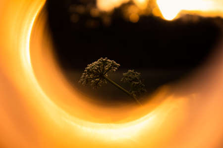 Beautiful queen Anne's lace flowers with artistic light flares. Wildflowers growing in the rural meadows in Northern Europe.
