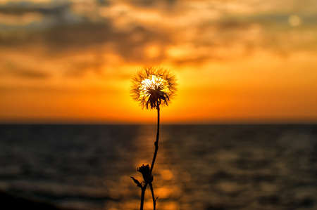 Close-up of a dandelion on the background of a sunset in the sea. Beautiful seascape. For posters, calendars.