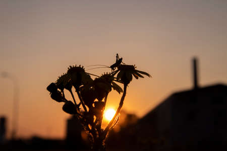 Cricket backlit by magnificent sunset on the solitary flower growing by the abandoned rail tracks in front of old heating plant on the outskirts of Zagreb city