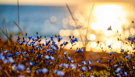 A beautiful and tranquil scene of wild blue flowers in bloom, with the setting sun reflecting on the sea in a stunning bokeh effect. The warm, golden light and the calm blue tones create a peaceful and romantic atmosphere, perfect for themes of nature, relaxation, and travel.